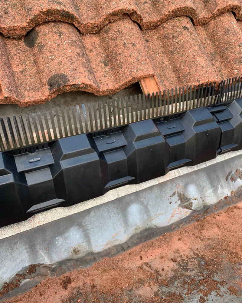 Roofguard is ontworpen om vogels, knaagdieren en ander ongedierte te weren onder uw dakpannen. Daarnaast beschermt roofguard uw dakvoet tegen opspattend regenwater. Door de flexibele opstaande spijlen vormt het profiel zich perfect naar uw dakpan, om zo volledige bescherming te garanderen. roofguard is gemakkelijk te installeren en totaal onderhoudsvrij.